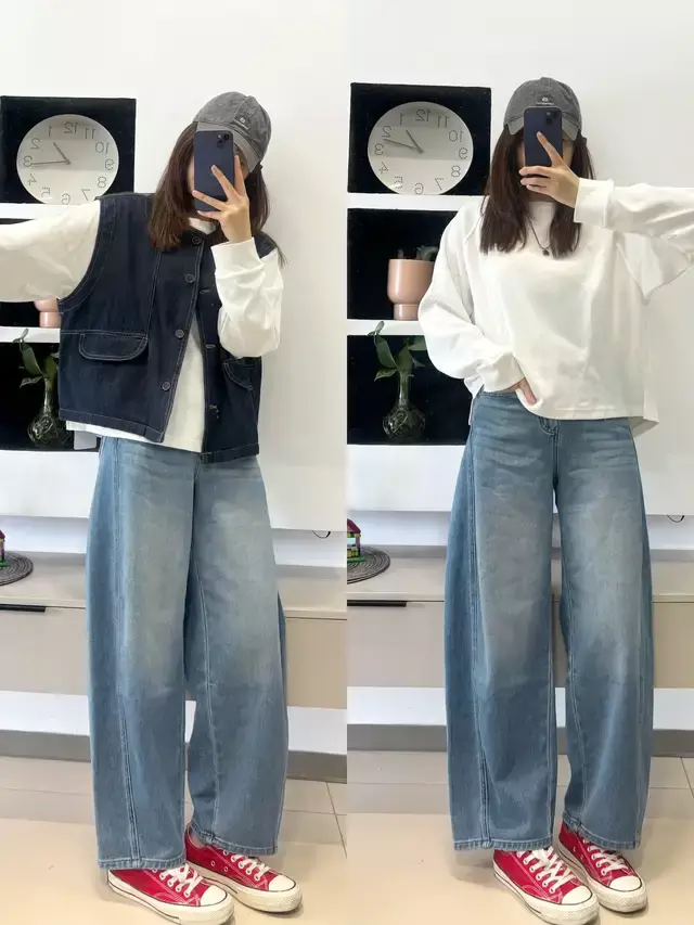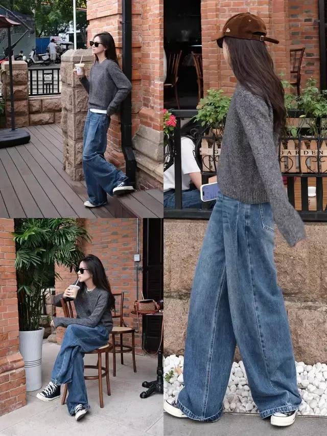 身材有点微胖,我们可以选择微宽松的白色长袖上衣来穿搭,下半身用一条高腰收腰的牛仔阔腿裤,就可以把腰间赘肉、胯宽腿粗、身材困惑全部藏起来。