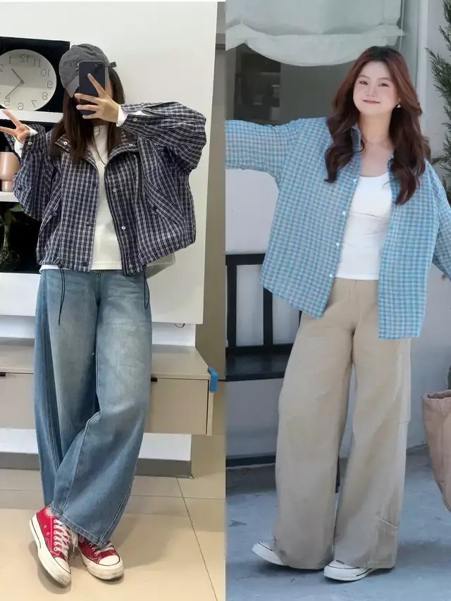 或是采用繁简结合的搭配方案,用格纹夹克外套或者是格纹衬衫内搭白 T 恤和一条阔腿长裤,脚踩一双帆布鞋,解决了穿衣配色过于单调问题,让人看起来更精致。