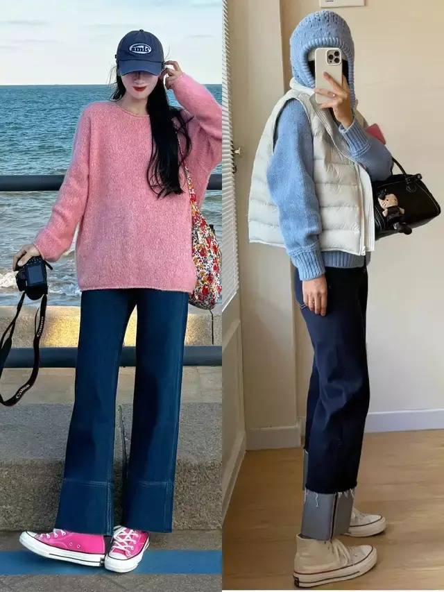 搭配鞋子的颜色也不能乱搭,我们要根据上衣的色彩来决定穿什么样的鞋子颜色。例如,当我们选择粉色针织毛衣搭配蓝色牛仔裤,脚上就可以选择粉色帆布鞋。