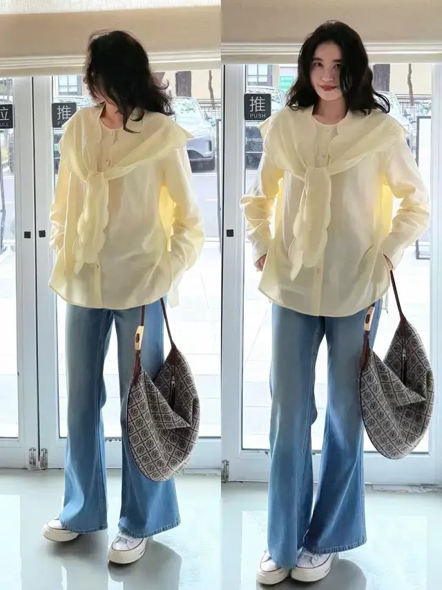 春风吹来,带着暖意,我们已经不用再裹着厚厚的冬装,选择清爽的穿搭造型更利落,用一条挺括有型的蓝色牛仔微喇叭裤,配上白色的帆布鞋和鹅黄色的薄款衬衫,这样的配色避免视觉杂乱,同时又能呈现出春日的氛围感。