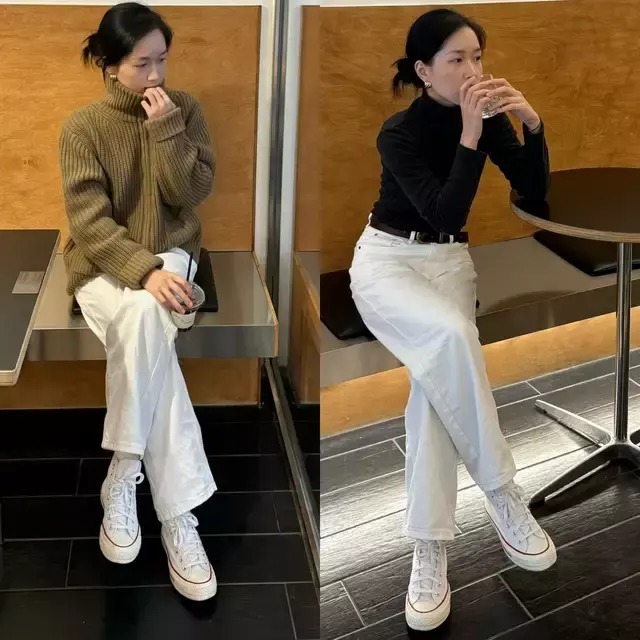 当然,我们还可以更简单一点的配色,用黑色针织上衣配白色牛仔裤,脚踩白色帆布鞋,黑白色调穿搭,经典耐看。