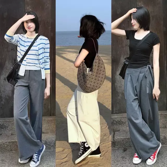 在这春天真的不用去刻意凹自己的造型,选择一条灰色西装阔腿裤或是白色阔腿裤,配上一双帆布鞋,搭配针织短袖或是针织开衫就自带慵懒气质,温柔又有态度。