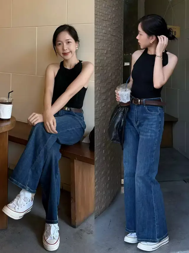 当然啦,同样是白色帆布鞋和蓝色牛仔微喇叭裤长裤,但当我们换了上衣之后,气质就有些改变,例如上面就用了修身的挂脖式无袖针织上衣来组合,形成了松紧结合的搭配,更容易勾勒出凹凸有致身形,随性又时髦。