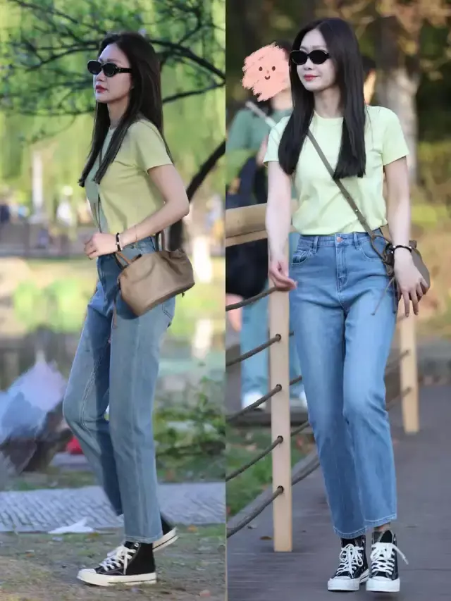 帆布鞋的版型也是多种多样,若是想要更好地修饰咱们的腿型,可以选择上面这一双黑色的中帮帆布鞋,配上蓝色牛仔直筒九分裤和一件牛油果绿 T 恤,能够使得穿搭者简约又不失精致感。