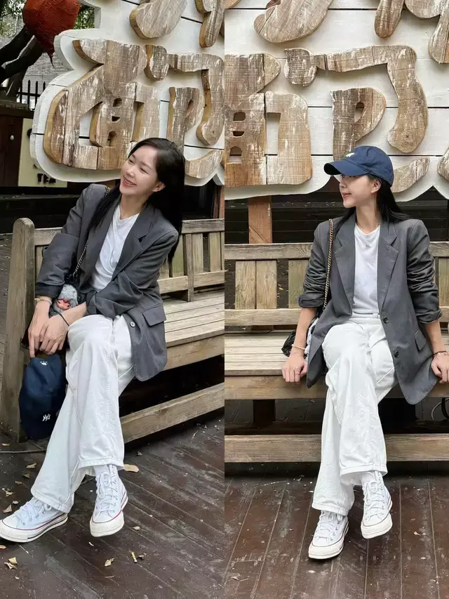下半身可以选择一条蓝色牛仔裤或是一条美拉德色系的西装裤,脚上穿上一双帆布鞋之后就能让你变得比较休闲,增添了精致感与温柔元素。