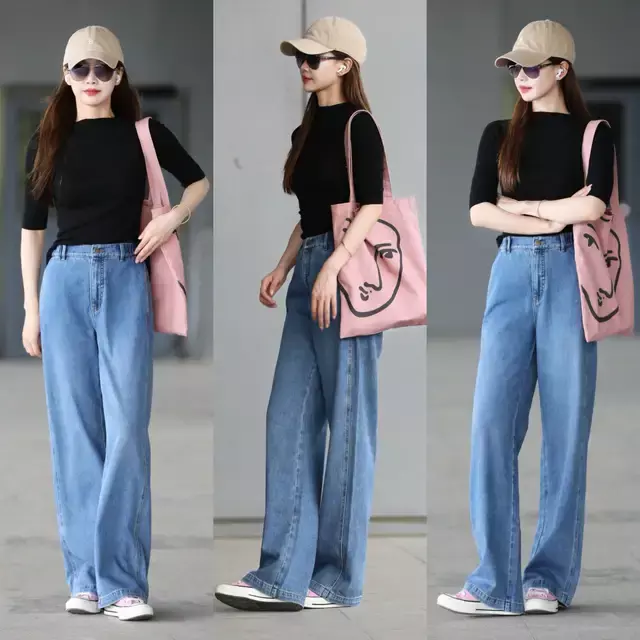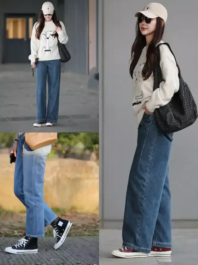 要是当咱们换上一款白色的牛仔直筒阔腿裤来穿搭,不光遮肉显瘦,正好和白色的帆布鞋、白色的 T 恤形成顺色搭配,纯净的白让人看起来更干净利落。