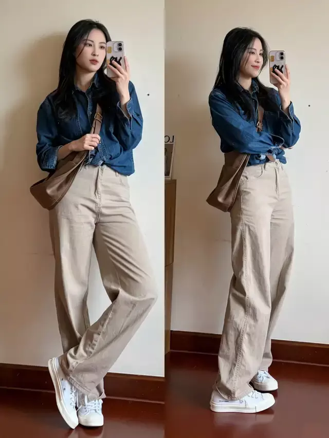 同样是牛仔衬衫,穿搭的方式不同,下装的款式不一样,气质也会发生一点改变,例如上面把牛仔衬衫衣角扎个蝴蝶结形成高腰线,下半身用卡其色的休闲直筒裤来组合,脚踩白色帆布鞋,这样的穿搭随性又不失精致感。